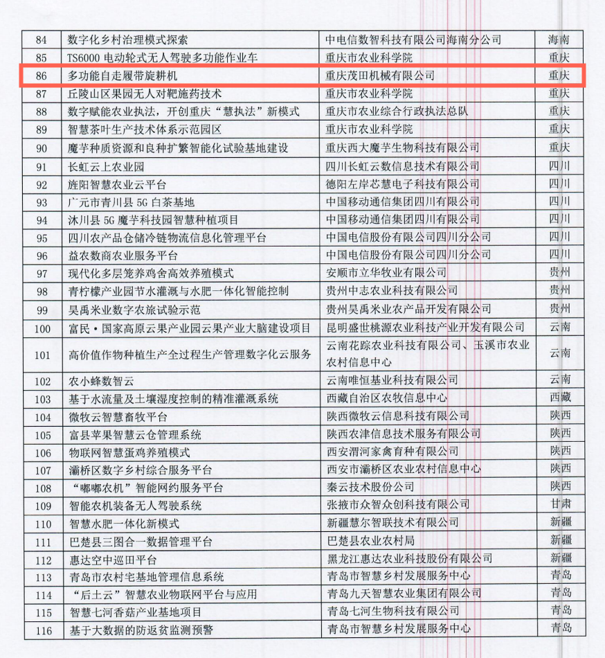 近日,農(nóng)業(yè)農(nóng)村部信息中心公布了“2023數(shù)字農(nóng)業(yè)農(nóng)村新技術(shù)新產(chǎn)品新模式推介優(yōu)秀項目”名單。重慶茂田機械有限公司開發(fā)的“多功能自走履帶旋耕機”項目成功入選。